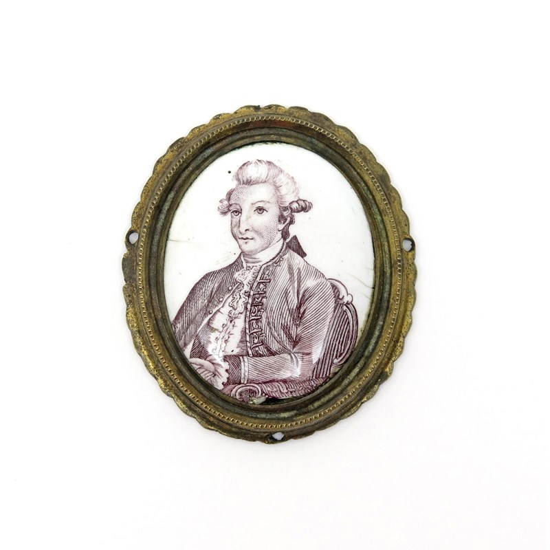 A small Birmingham enamel theatrical portrait plaque c.1780-90, printed in manganese with a portrait of Samuel Reddish in the role of Young Bevil, set in a brass mount, 6cm overall.