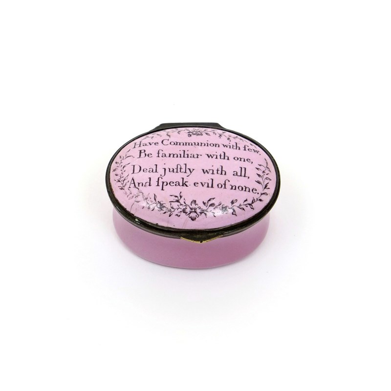 An English enamel patch box c.1780-90, the oval form inscribed in black to the lid with 'Have Communion with few, Be familiar with one, Deal justly with all, And speak evil of none', within delicate flower sprays on a pink ground, the inside of the lid with a mirror, some good restoration to the base, 4.3cm.