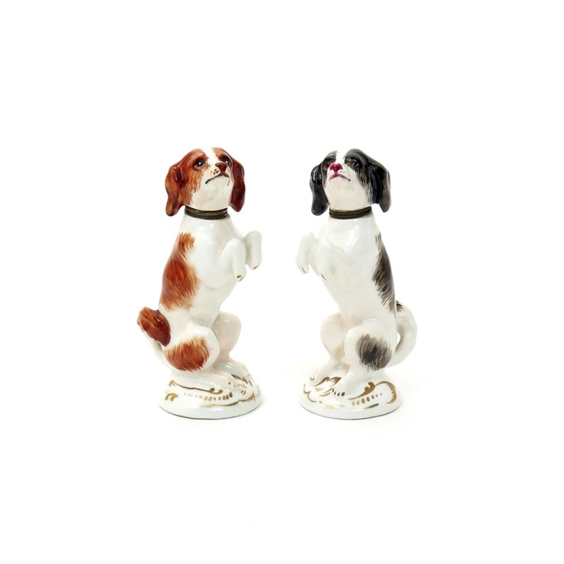 Two English porcelain scent bottles 19th century, after Meissen, each formed as a begging dog raised on its haunches, one decorated with black patches, the other with russet, their heads forming the metal-mounted stoppers, 9cm. (2)