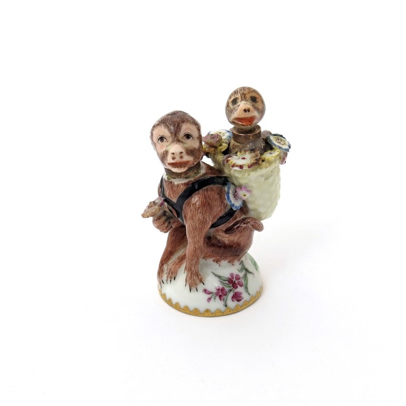 A Chelsea double scent bottle c.1755-60, modelled as a monkey perched on a dome base and holding a flower in its right paw, a baby monkey strapped to its back, emerging from a basket of flowers, the base naturalistically painted on both sides with flower sprays, the heads of both monkeys forming the stoppers, some faults, one stopper a replacement, 5.5cm.