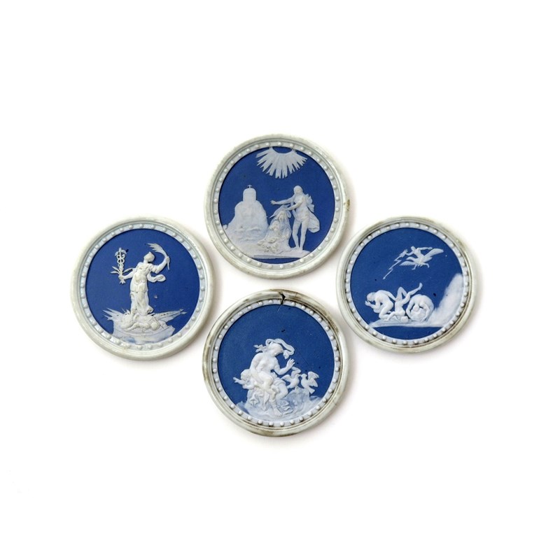 A set of four Doccia circular plaques or roundels mid 18th century, each depicting a Classical scene, including Jupiter hurling a thunderbolt, Venus punishing Cupid, and Asclepius holding his staff, all applied in white on a blue ground, within raised beaded borders, one broken and restuck, 6.3cm. (4)
