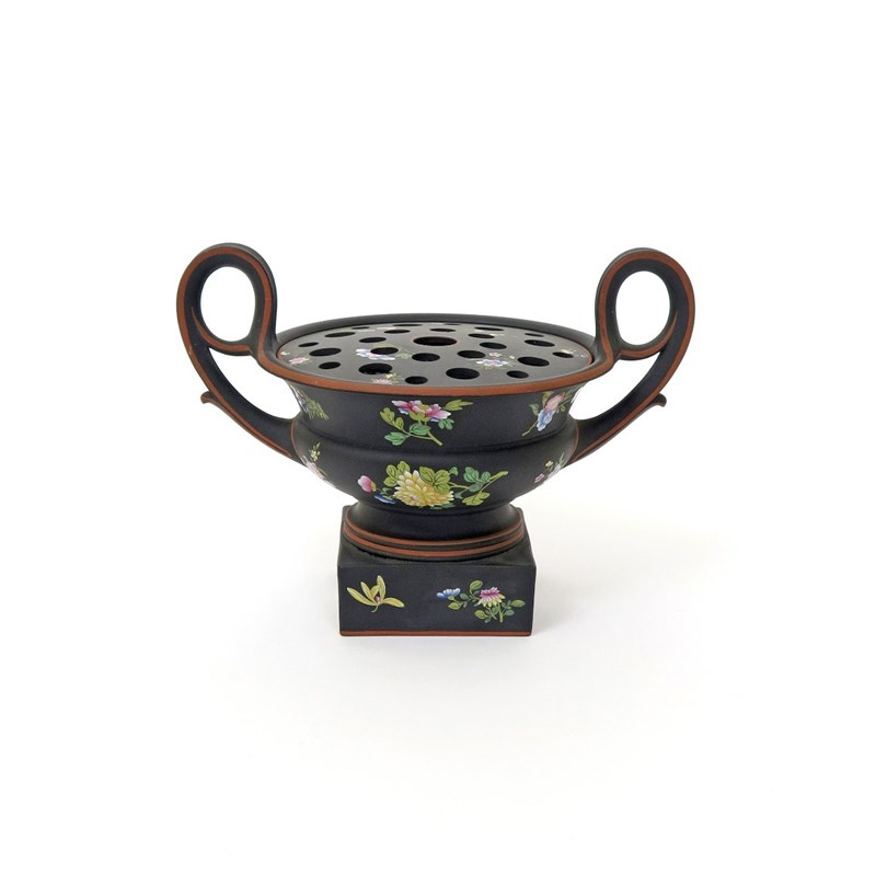 A Wedgwood black basalt pot pouurri vase and two covers c.1820, of Krater form, with wide two-handled body painted with Oriental flowers in polychrome enamels, edged in terracotta bands and raised on a square base, impressed WEDGWOOD mark, some chipping, 24.5cm high.