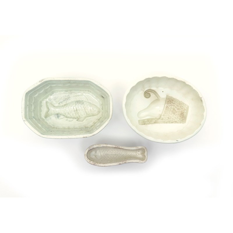 Three creamware jelly moulds c.1820-40, one Wedgwood and moulded with the head of a ram, the other two with fish, minor faults, 15.5cm max. (3)