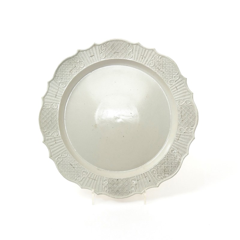 A massive salt-glazed charger c.1760, the shaped rim moulded with differing panels of basketweave and hatched diaper designs, 42.5cm.