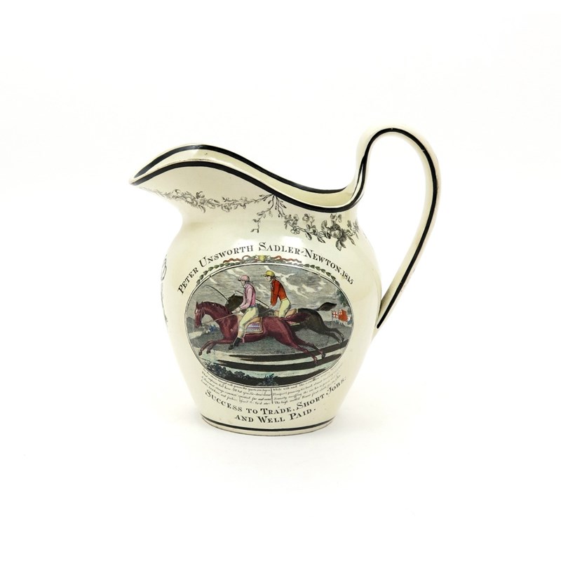 A documentary creamware jug dated 1815, printed and coloured to one side with a scene of two racehorses being ridden by jockeys in bright colours, the reverse with a sad looking old nag, each above an eight line poem, inscribed 'Peter Unsworth Sadler-Newton, 1815', some restoration, 25cm.