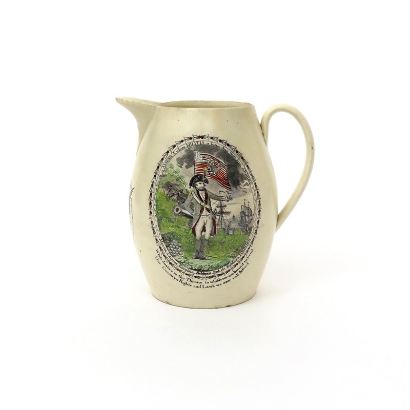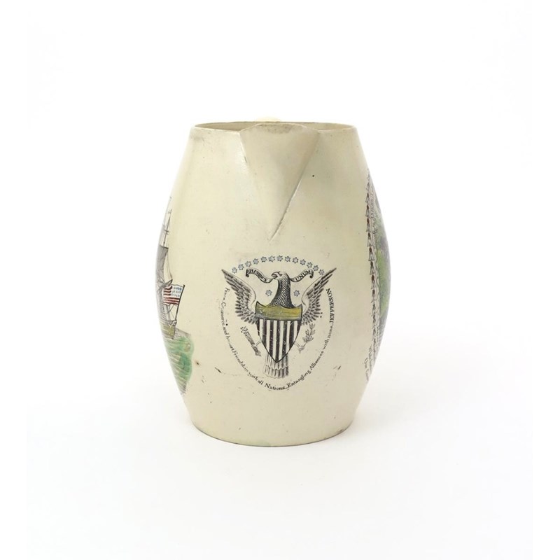 A large creamware jug of American interest c.1804, printed and hand-coloured to one side with a French soldier standing beneath the American flag with ships in the background, titled 'Success to America whose Militia is better than Standing Armies, May Its Citizens Emulate Soldiers and its Soldier Heroes', a further two line stanza beneath, to the reverse a three-masted ship, beneath the spout the American Eagle surrounded by a quote from Thomas Jefferson's inaugural speech of 1801, some restoration, 22.7cm high.