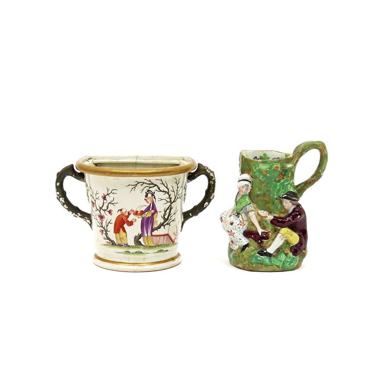 A small pearlware Fair Hebe jug early 19th century, modelled with two figures and a bird's nest, and a Davenport pearlware bough pot, painted in polychrome enamels with two Chinese figures beneath bare trees, the cover lacking, cracked, 13cm max. (2)