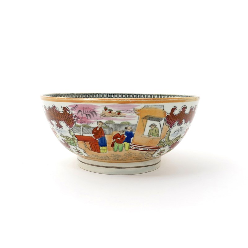 A pearlware punchbowl 1st half 19th century, printed and hand-coloured with the Boy in a Window pattern, of Chinese figures in garden settings, the interior with a wide decorative border beneath a copper lustre rim, small faults, 24.2cm dia.