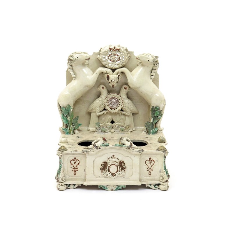 A Continental creamware inkstand 19th century, the large square form set with two circular apertures, a tall back plate behind, modelled with two rearing horses above two birds beside a large flowerhead, the front moulded with a crowned shield flanked by lions, picked out in red and green enamels, some damages, 26.8cm high.
