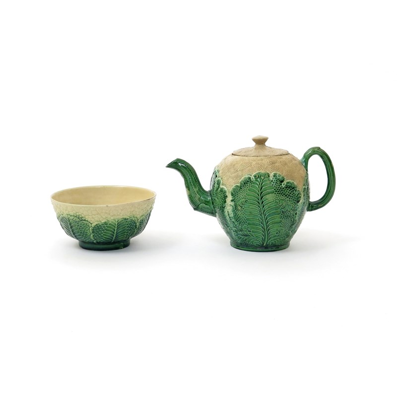 A creamware teapot and cover c.1760, modelled as cauliflower with creamy florets issuing from rich green leaves, with a similar creamware slop bowl, some restoration, the cover a replacement, 21cm max. (3)