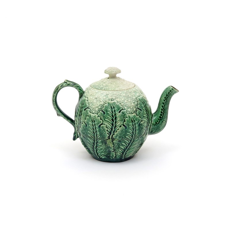A small creamware cauliflower teapot and cover late 18th century, modelled with creamy florets to the cover and shoulders, issuing from large green leaves, 17cm. (2)
