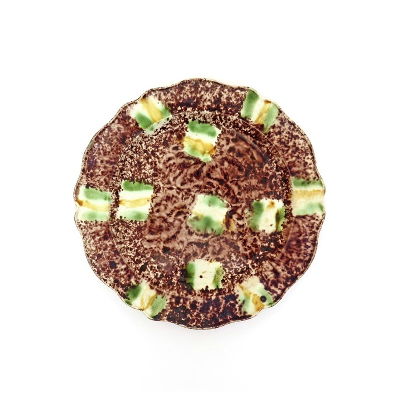 A Whieldon creamware plate c.1770, with a lobed rim, decorated with striped splashes of green and yellow on a mottled manganese ground, small rim chips, 23.3cm.