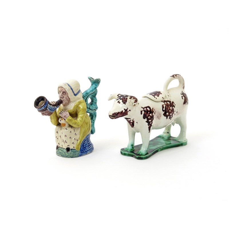 A creamware cow creamer and cover c.1790, standing four square on a shaped flat green base, her coat sponged with manganese patches, together with a pearlware figure of a woman smoking a large pipe, a cat resting on her lap, two scrolled fish forming a handle to her back, minor faults, 17.5cm max. (3)