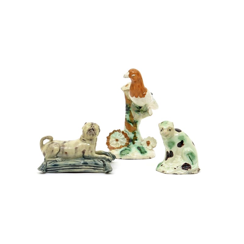 Three creamware models of animals late 18th/early 19th century, one of a pug recumbent on a blue tasselled cushion, its head turned to dexter, one of a monkey seated on its haunches and decorated with green and manganese splashes, the last of a bird perched on a flowering stump, decorated in green and ochre, small damages, 12.2cm max. (3)