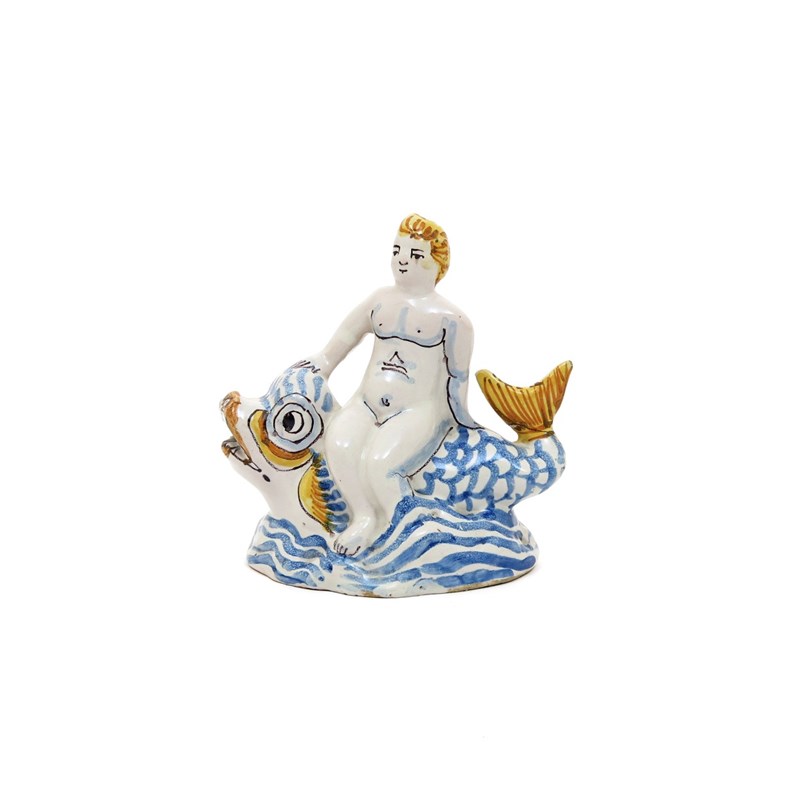 A maiolica ewer c.1700, possibly Belgian, modelled as a putto seated on the back of a dolphin, its mouth forming the spout, picked out in blue, yellow, ochre and manganese, the tail broken and restuck, 18.5cm high.