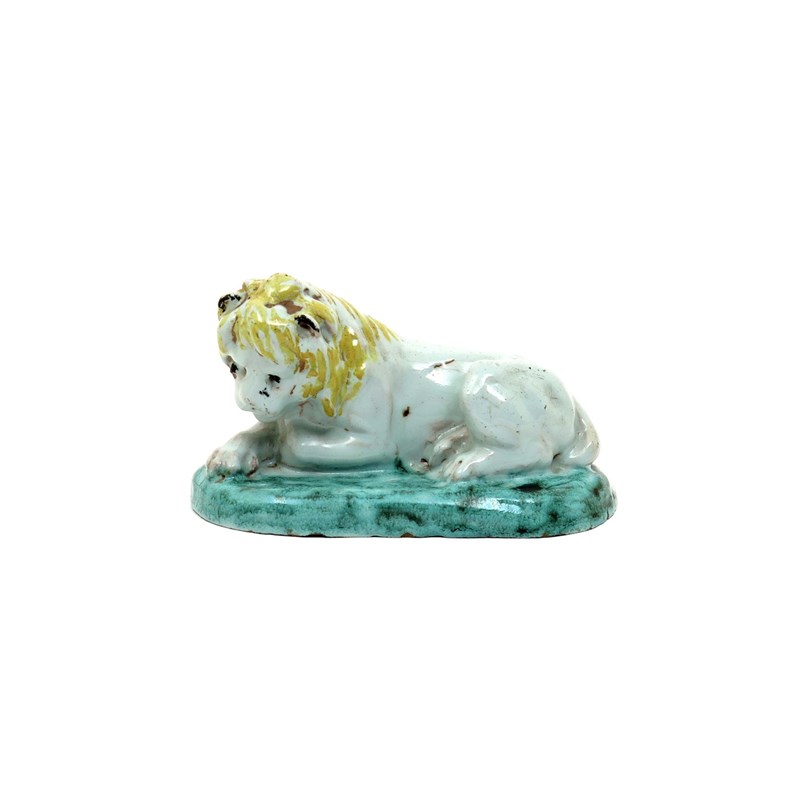 A Continental faïence model of a lion 18th century, recumbent with his front paws crossed and head lowered, on a low oval base glazed in green, his mane picked out in yellow, 16cm across.