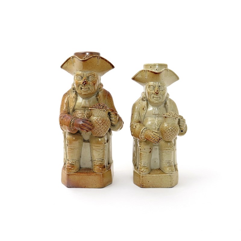 Two brown stoneware Toby jugs with stoppers 19th century, perhaps Derby, each seated with a scale-decorated jug of ale, their large noses moulded with warts, minor faults and restoration, 26.5cm max. (4)