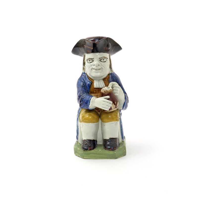 A Pratt ware Toby jug with stopper c.1800, of Ordinary type, seated and resting a foaming jug of ale on his knee, wearing a blue coat over ochre waistcoat and yellow breeches, raised on a green base, a chip to his hat brim, some enamel flaking, 24cm. (2)