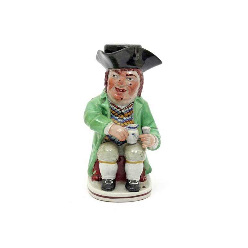 A Sinner Toby jug and stopper c.1800, wearing a pale green jacket over a bold chequered waistcoat, his warty face turned slightly to one side as his eyes look askance, his hat with a hollow stopper or measure, 20cm. (2)