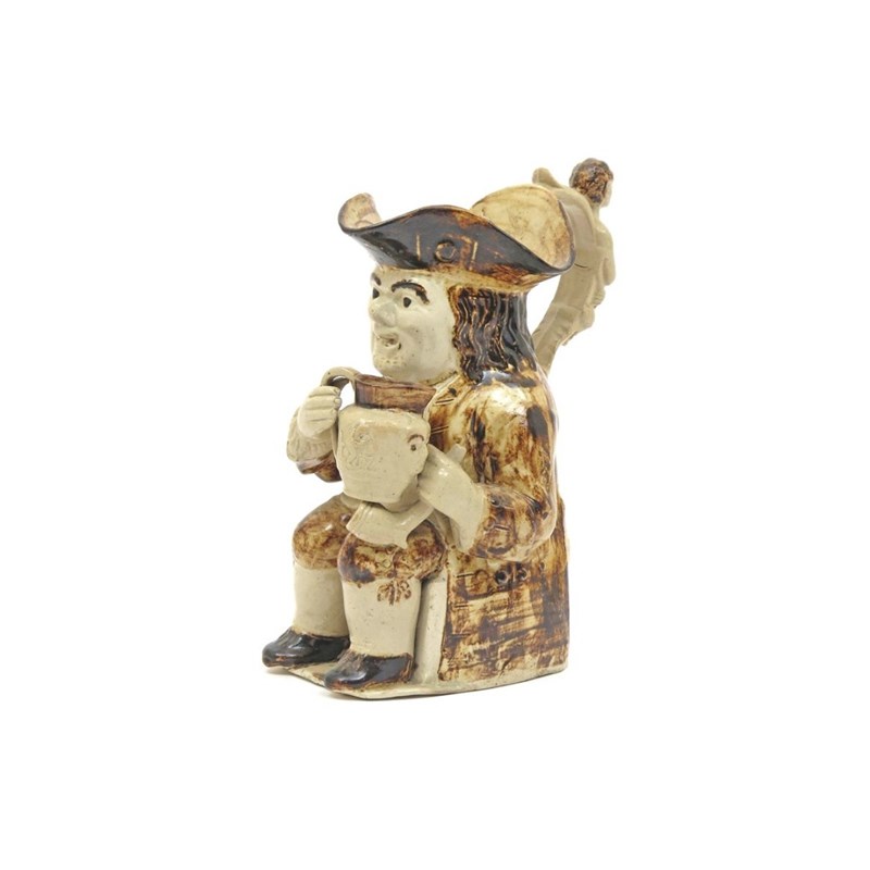 A rare Yorkshire creamware Toby jug c.1780, seated with a massive clay pipe, holding an empty jug moulded with Cupid to two sides and with a face beneath the spout, with caryatid handle, all picked out in a deep manganese and raised on a rare flat base, the top of his pipe stem restored, 24.5cm.