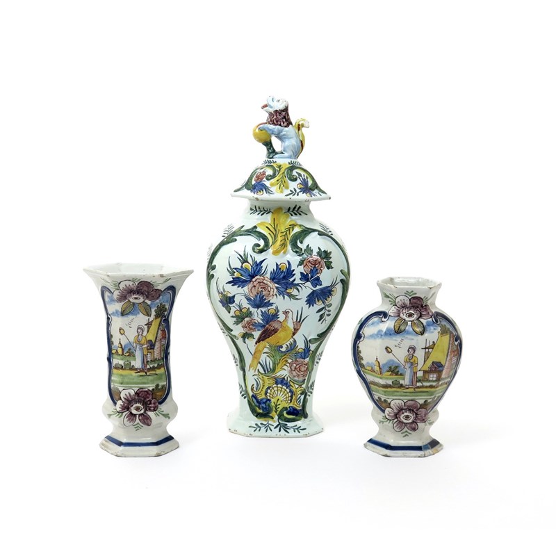 A large Delft vase and cover 19th century, brightly painted with a bird perched among flowering branches, the cover surmounted with a lion finial, and two Delft vases from a garniture, one flared, the other baluster, each painted with a female figure holding a mop and bucket, some damages, 46cm max. (4)