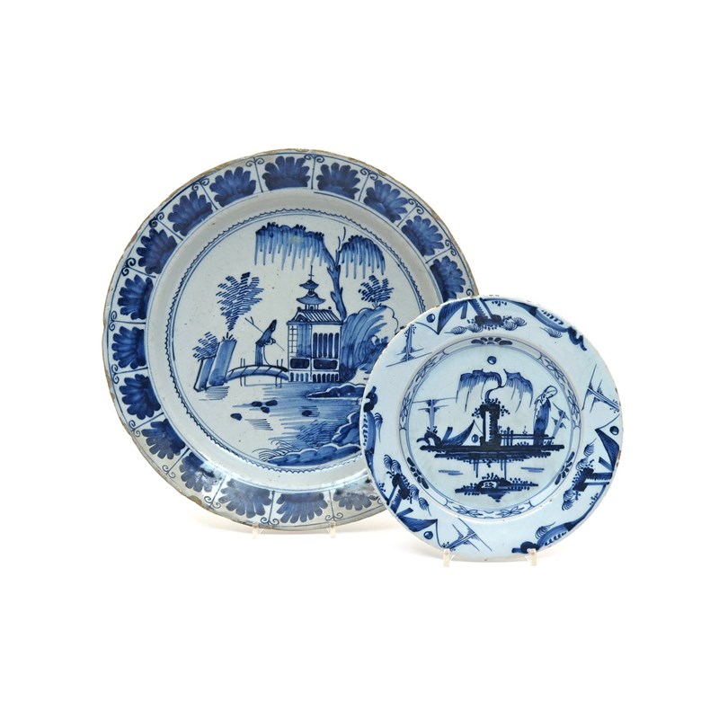 An English delftware plate c.1750, painted in blue with a tall Chinaman standing beside weeping willow, floral panels to the cavetto and further willow vignettes to the rim, and a Delft charger painted with a figure crossing a bridge in a pagoda landscape, the rim with a band of palmettes, some restoration to the latter, 34.5cm max. (2)
