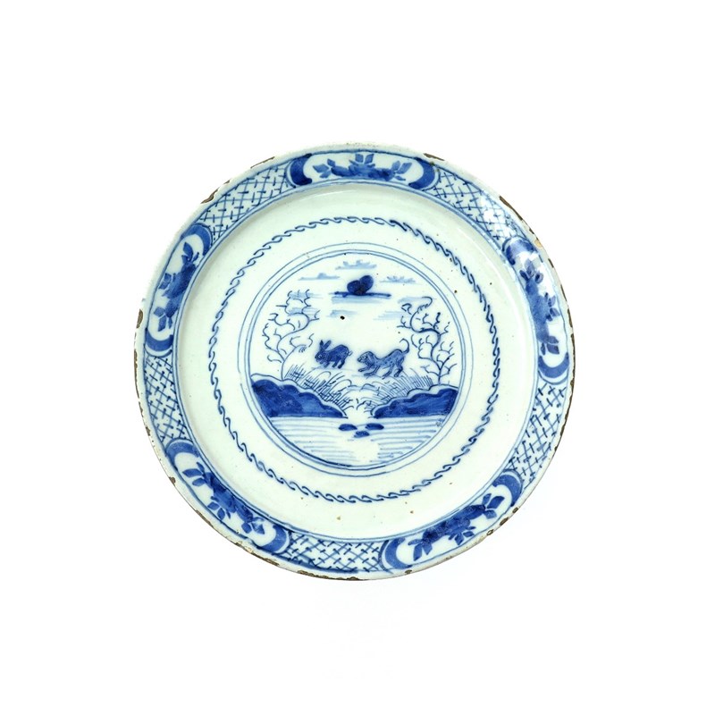 A Delft plate 18th century, the well painted in blue with a rabbit and a dog between bare trees, the rim with five floral panels reserved on a hatched diaper ground, some glaze chipping to the rim, 26.2cm.