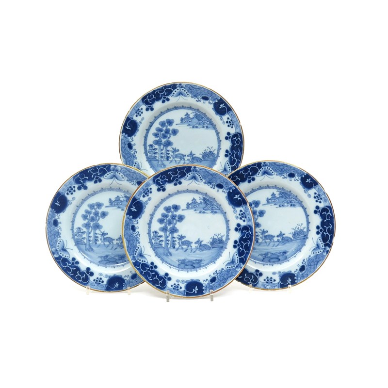 Four Irish delftware plates c.1750, painted in blue after a Chinese design, each with two fallow deer beside flowering bushes and tall pine trees, the rims with a wide Fitzhugh border, numeral 12 marks to the undersides, some chipping, 23.6cm. (4)
