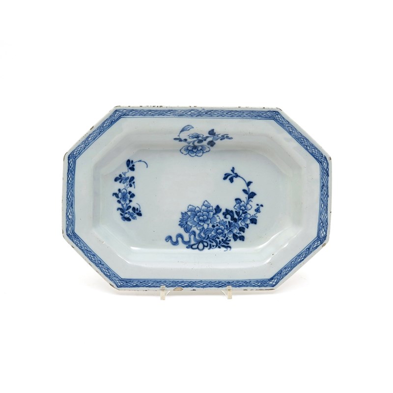 An Irish delftware octagonal dish c.1760, painted in blue with simple sprays of flowering peony within a hatched diaper border, numeral 2 mark to the reverse, a little glaze chipping, 29.8cm.
