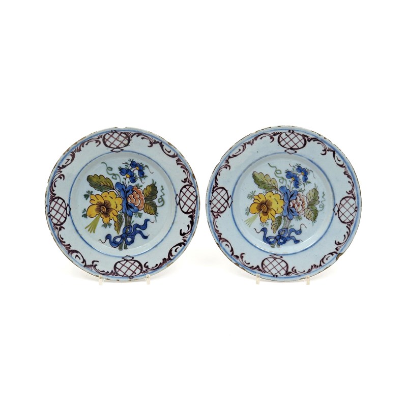 A pair of Delft plates 18th century, decorated in polychrome enamels outlined in manganese with tied posies of flowers, the rims with manganese pineapple motifs and foliate scrolls, some rim chipping, 23cm. (2)