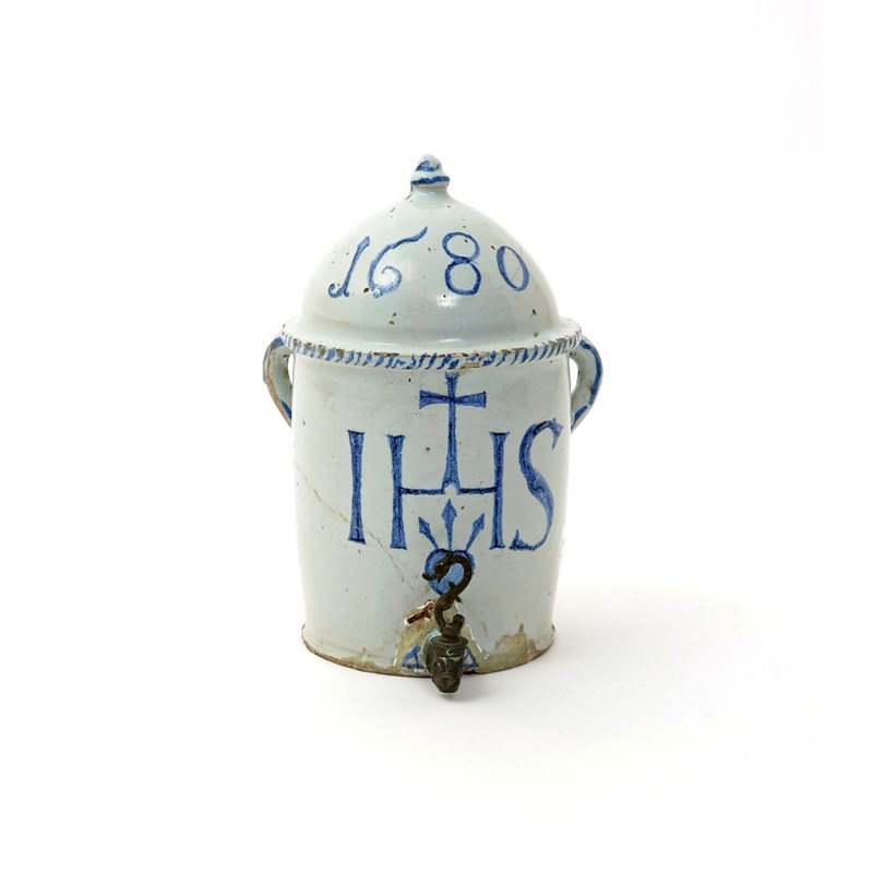 A Delft or faïence water cistern dated 1680, the flattened cylindrical form painted in blue with a Christogram and sacred heart above a later metal tap, the domed top inscribed '1680', damages, 24cm.
