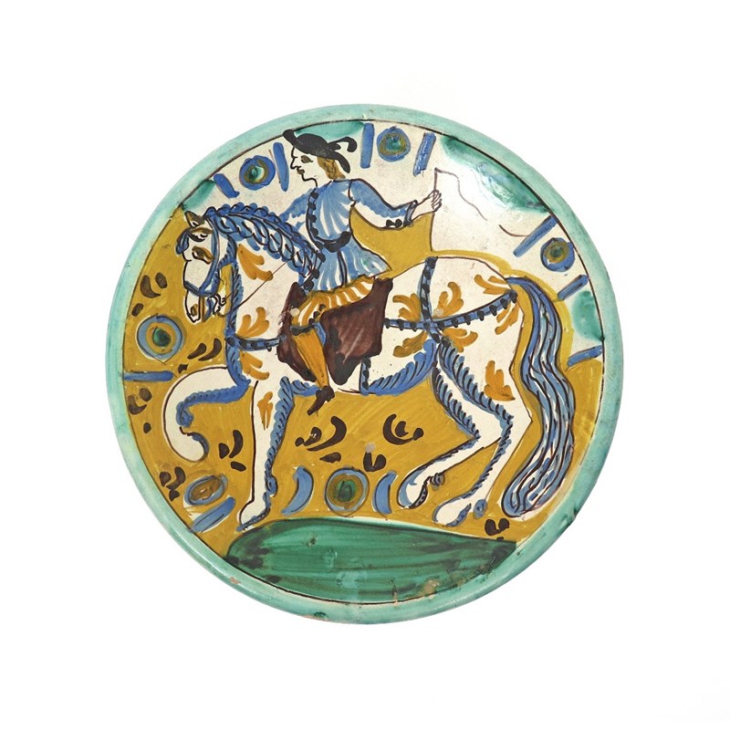 A Montelupo maiolica dish 17th century, painted in a bold palette of blue, green, ochre and manganese with a figure on the back of a large horse, a chip to the underside of the rim, 29.7cm.