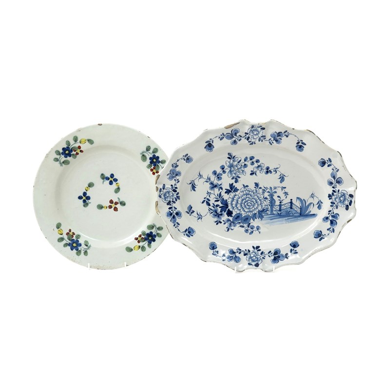 A large English delftware plate mid 18th century, decorated in the Fazackerly palette with simple scattered flower sprays, and a large shaped delftware dish with moulded rim, painted in blue with a vase of flowers beside bold peony sprays, some glaze chipping, 41.5cm max. (2)