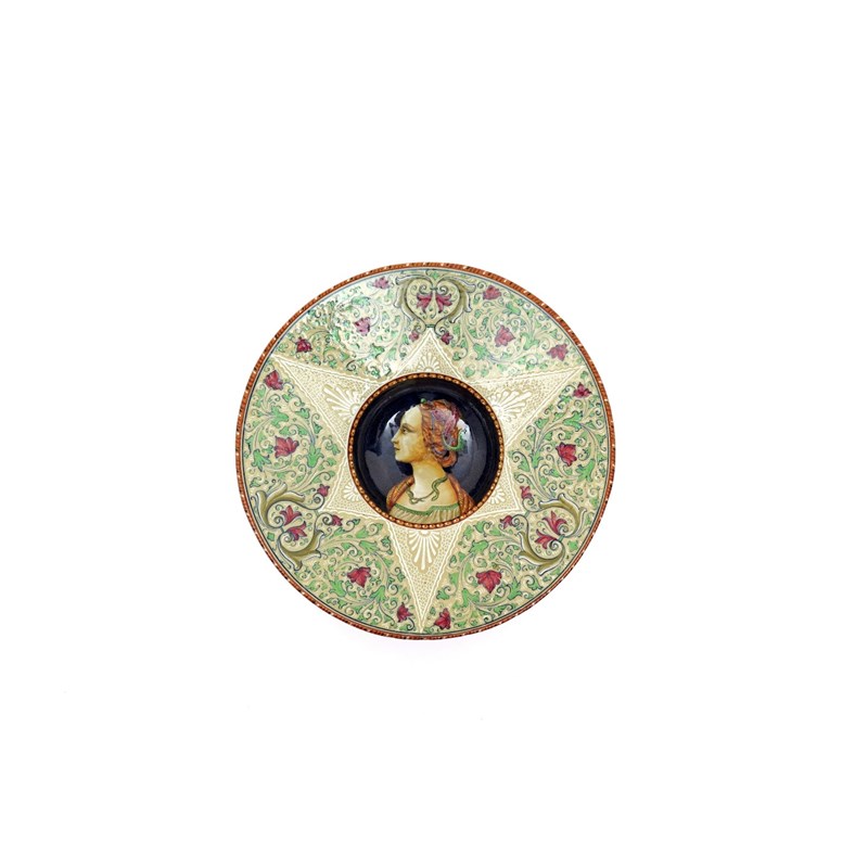 An Italian maiolica portrait dish early 20th century, Vincenzo Molaroni of Pesaro, the deep well painted with the head and shoulders portrait of a young girl wearing a green serpent as a necklace, the wide rim with a continuous foliate design against a buff ground, 26.5cm.