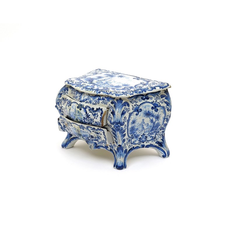 A Delft miniature model of a commode 19th century, the bombé form modelled with two workable drawers, painted in blue with panels of figures, to the top a lady painting a landscape, within C scroll borders, blue IDM mark to the underside, some chipping, 24cm across. (3)