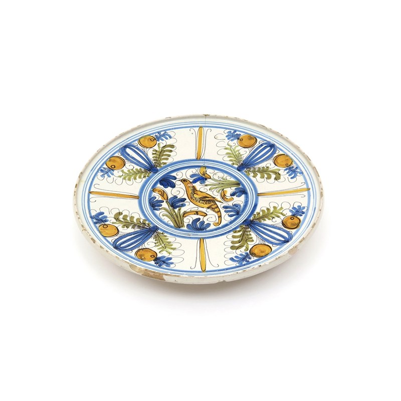 A Deruta maiolica tazza c.1660-80, the circular form painted in blue, green and yellow with manganese detailing, with a bird amidst foliage to the well, the rim with four panels of stylized fruits, raised on a low flared foot, a section broken out and cleanly restuck, 26.5cm.