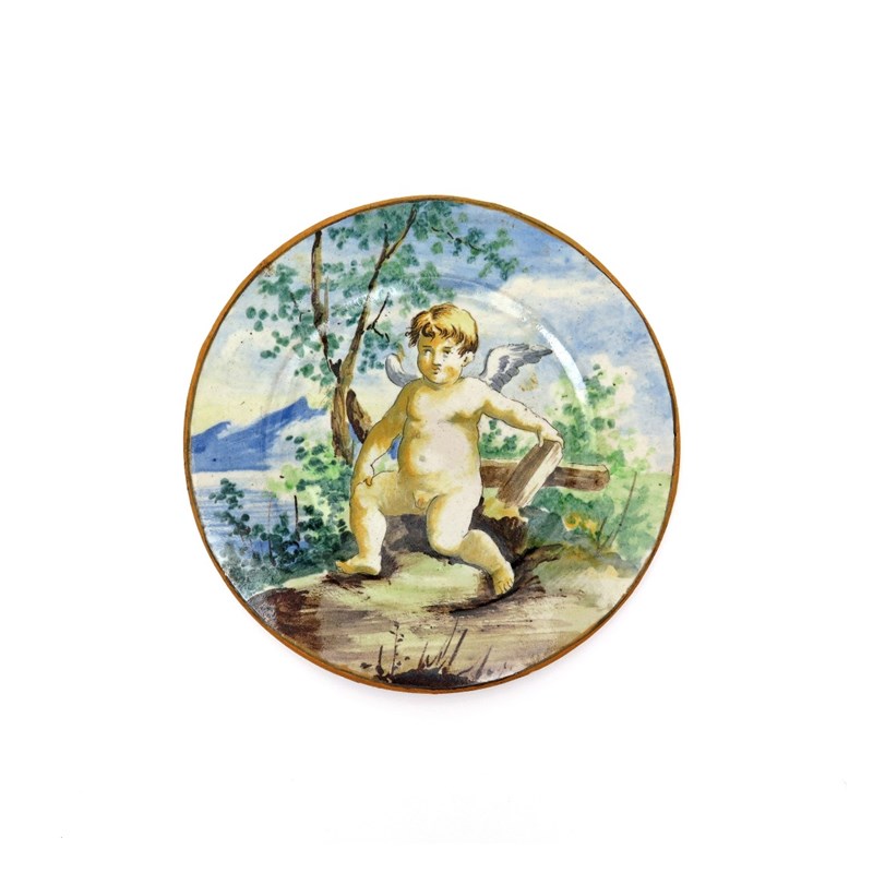 A small Italian maiolica plate Castelli c.1740, painted with a winged putto seated on a stump beneath a tree, with blue mountains in the distance, edged in ochre, a chip to the underside of the rim, 19.3cm.