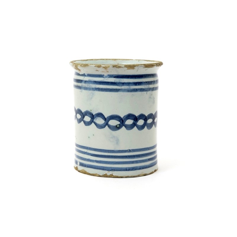 An English delftware apothecary jar 18th century, probably London, the cylindrical body painted in blue with horizontal bands and a band of chain, some chipping to the rim, 14.2cm.