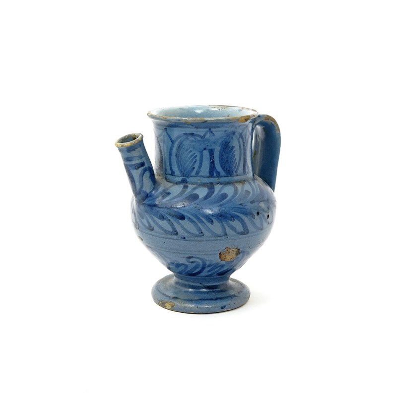 An Italian maiolica syrup or wet drug jar c.1700, from The Marches region, decorated in blue with wide foliate sprays beneath an egg and dart border, on a pale blue ground, with wide strap handle, and raised on a low circular foot, a little rim chipping, 18.8cm.