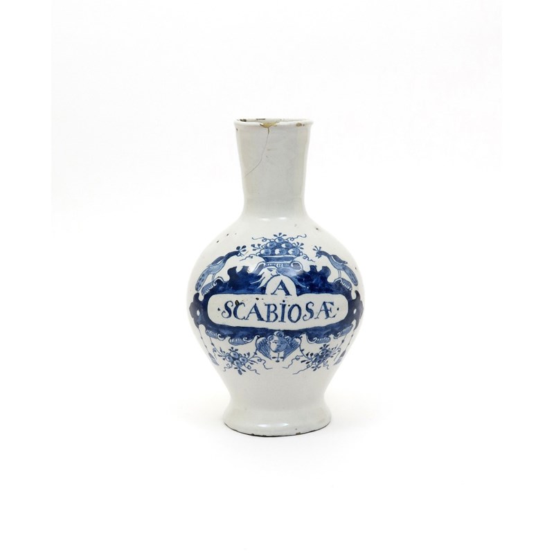 A Delft drug jar c.1720, of bottle shape with rounded body and a tall flared neck, painted in blue with two peacocks beside a basket of fruit atop a banner inscribed 'A Scabiosæ', a crack and chip to the neck, 25.5cm.