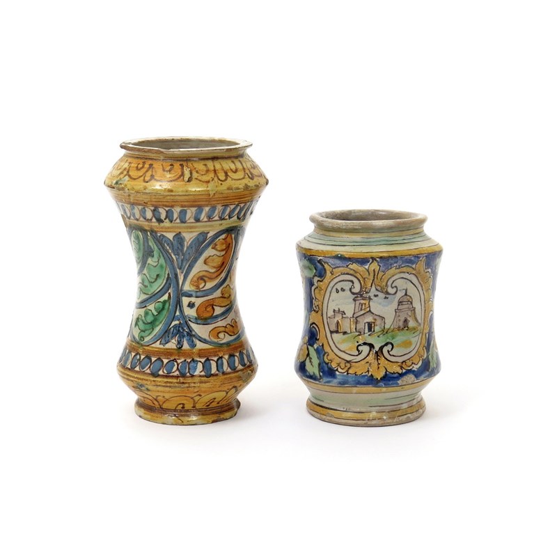 Two Sicilian (Caltagirone) maiolica albarelli late 17th/18th century, one of squat form and painted with a cartouche of buildings within typical green and yellow flowers on a blue ground, the other tall and waisted, decorated with oval panels of stylized leaves, some damages and restoration, 25cm max. (2)