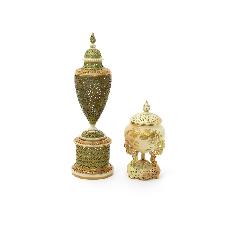 A Grainger's Worcester reticulated vase with cover and stand date code for 1901, elaborately pierced with a continuous foliate design decorated in green and peach gilt lustre, the stand with a trefoil design and perhaps associated, and another Grainger's vase and cover, date code for 1897, decorated with a gilt prunus spray, raised on a reticulated base, the cover similarly pierced, some restoration, 34.7cm max. (5)