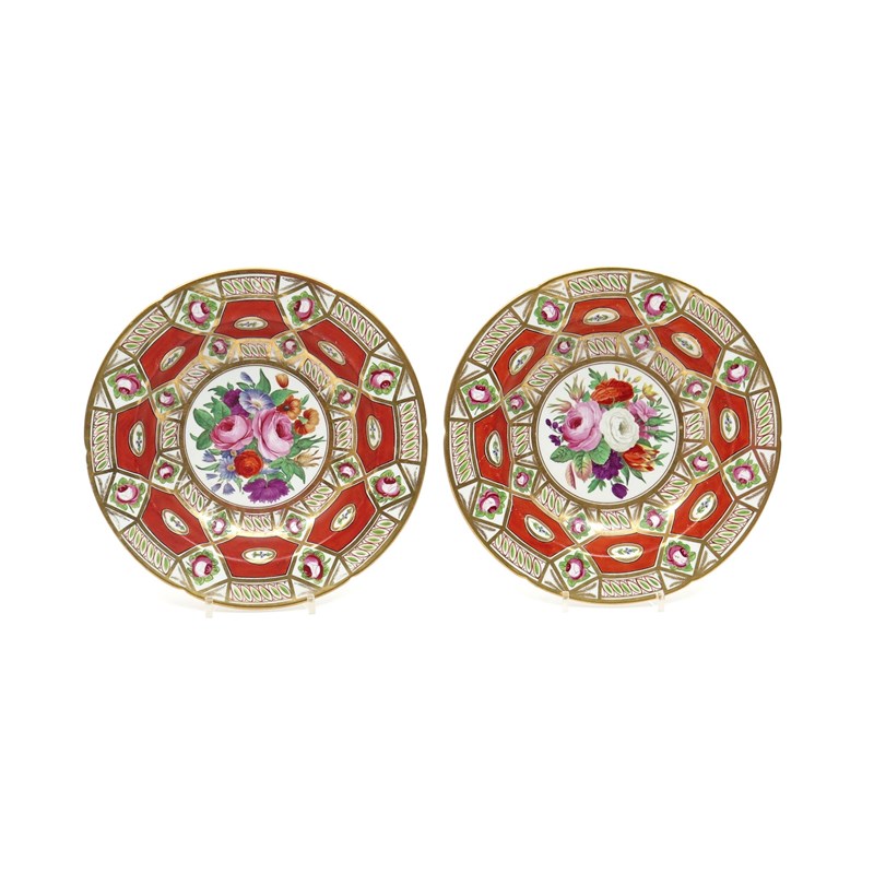 A pair of Coalport soup plates c.1820, richly decorated in the Church Gresley pattern, with small cornflower florets reserved in hexagonal red panels amidst smaller panels of pink rosebuds and stylized leaves, the wells with bold floral arrangements, 24.7cm. (2)