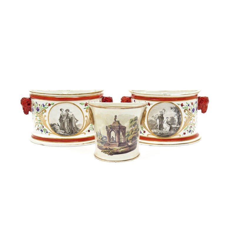A pair of Derby bough pots c.1795, the D shapes painted with en grisaille panels of Virgins awakening Cupid, and of nymphs mocking Cupid tied to a tree, after Angelica Kauffmann, between gilt cornucopia issuing cornflowers and other blooms, with red rams head handles, and a smaller English porcelain bough pot painted with a figure beneath Classical ruins, the covers lacking, 24.8cm max. (3)