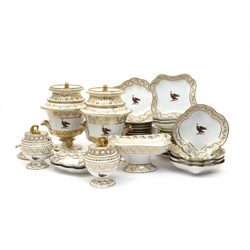 A Chamberlain's Worcester part armorial dessert service c.1800, decorated with the crest of an eagle holding an arrow in its beak, within gilt foliate scroll borders, iron red script marks. Comprising: two ice pails with a choice of two covers for each, two sauce tureens and covers, four square dishes, four shell-shaped dishes, two kidney-shaped dishes, a quatrefoil dish, a tazza and twenty plates. (42)