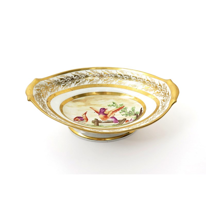 An English porcelain comport or centrepiece early 19th century, the oval form painted to the interior with three brightly coloured birds perched on and beside a low fence, within a wide stylized foliate gilt border echoed to the underside, some regilding to the handles. 31.3cm.