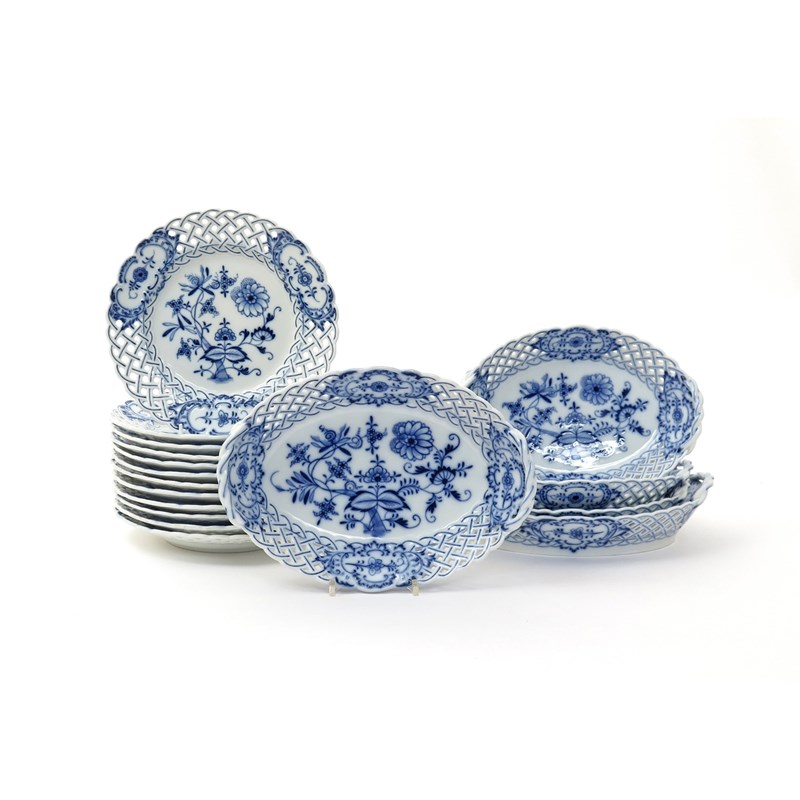 A Meissen-style part dessert service late 19th/20th century, decorated in underglaze blue with the Onion or Zweibelmuster pattern within reticulated rims. Comprising: two large and three small two-handled basket dishes, and twelve plates. (17)