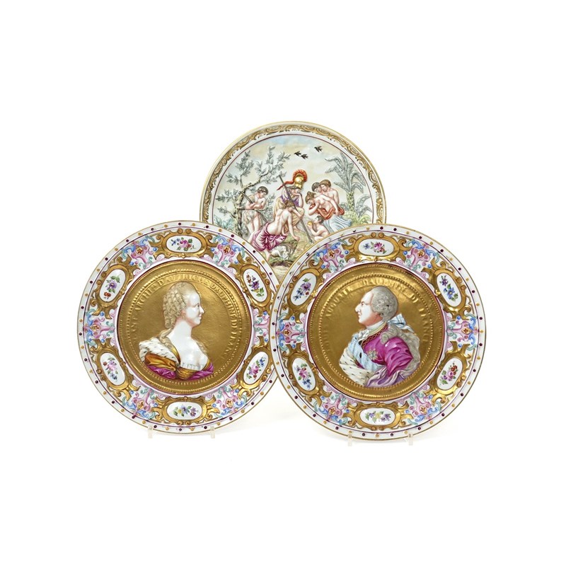 A pair of Naples porcelain portrait plaques 19th century, in the Doccia manner, decorated in high relief with profile portraits of Louis XVI and Marie-Antoinette, within embossed borders of floral panels, and a Doccia style plate with a moulded scene of Classical figures in a landscape, crowned N marks in blue, 25.7cm max. (3)