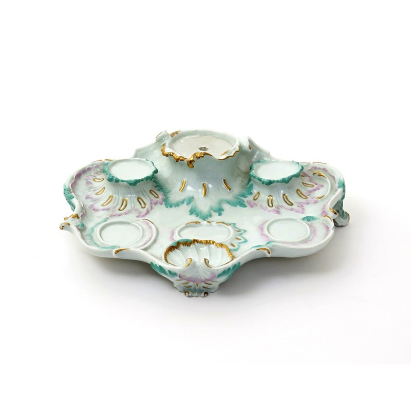 A Meissen surtout de table or stand 19th century, of rococo scrolling form, raised on three scroll feet and picked out in green, pink and gilt, blue crossed swords mark, 32cm across.