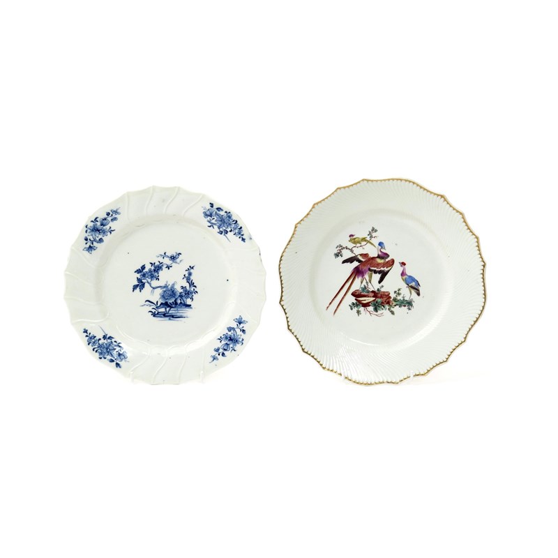 Two Tournai plates c.1770-80, one brightly enamelled with fancy birds perched on a low rock, within a close spiral moulded rim, the other with wide spiral flutes and painted in blue with the Ronda pattern of peony and prunus, gilt and blue swords and stars marks respectively, the latter with an N mark, 23.8cm max. (2)